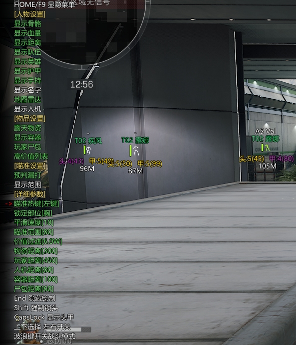 功能介绍:显示骨骼{头甲武器}+物资列表+容器+漏锁自瞄