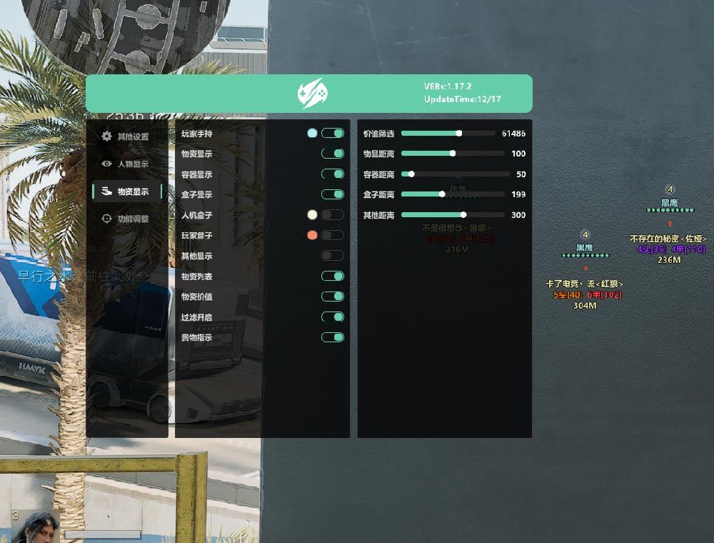 功能介绍:骨骼{头甲武器}+物资列表+地图雷达+锁+无后